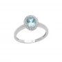 Anello donna Comete Collezione Azzurra Prestige in oro bianco 750‰ (18 Kt) con acquamarina prestige taglio ovale 7×5 di Ct. 0,8 contornata da diamanti per un totale di Ct. 0,10 Col. G Purezza SI. Dimensioni: larghezza centrale 10 mm – lunghezza centrale 8,19 mm – profondità centrale 5,15 mm.