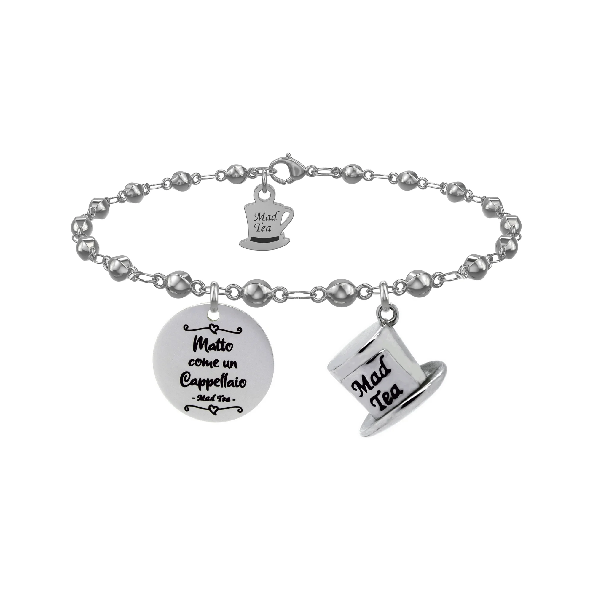 Bracciale con targhetta con incisa la frase “Matto come un Cappellaio” e il suo iconico cilindro.