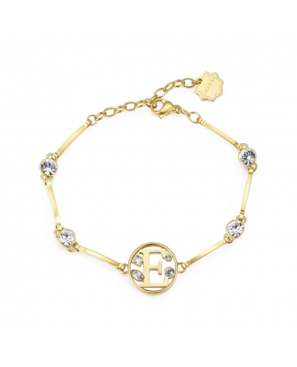 Bracciale da donna di Brosway della collezione chakra. Bracciale realizzato in acciaio dorato e cristalli con lettera E. Lunghezza: 185 mm.