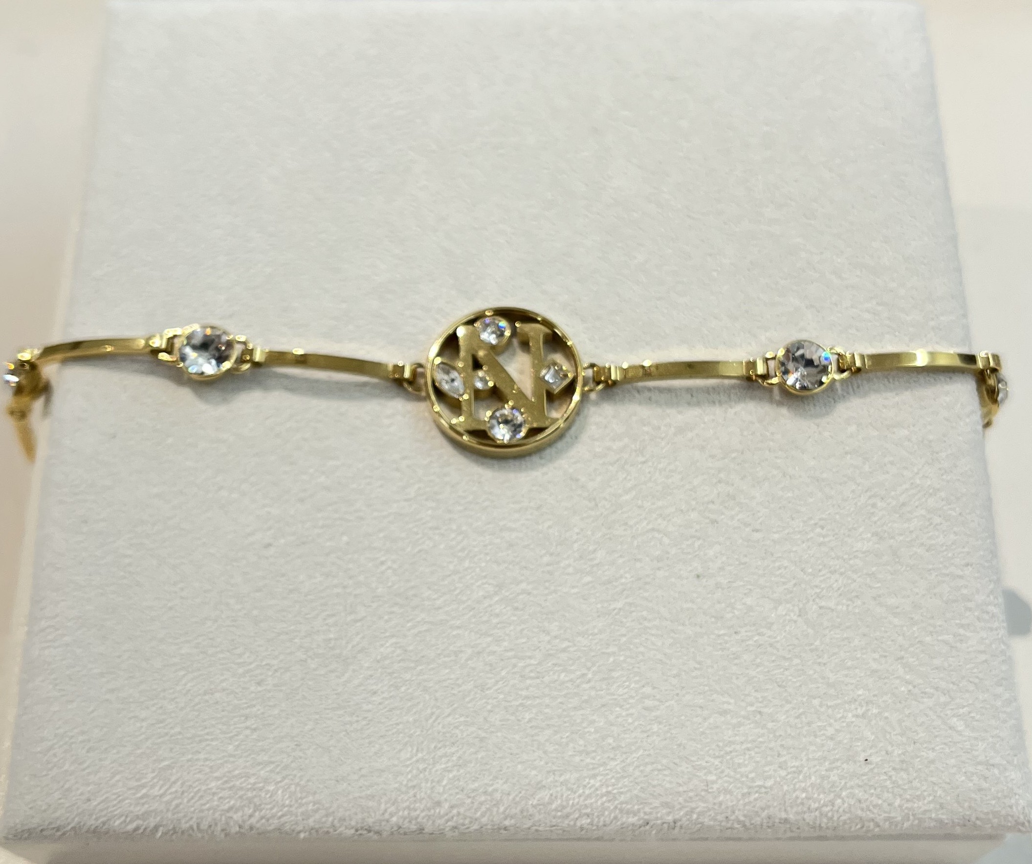 Bracciale da donna di Brosway della collezione chakra. Bracciale realizzato in acciaio dorato e cristalli con lettera N. Lunghezza: 185 mm.