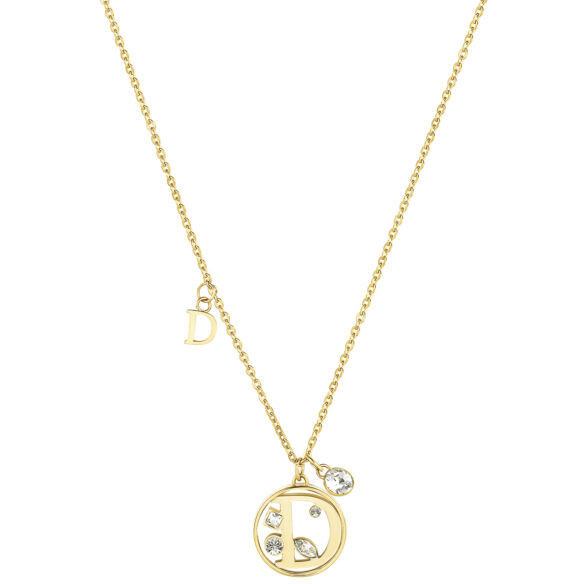 Collana da donna realizzata in acciaio anallergico dorato. Pendente tondo con lettera D impreziosita da zirconi bianchi.