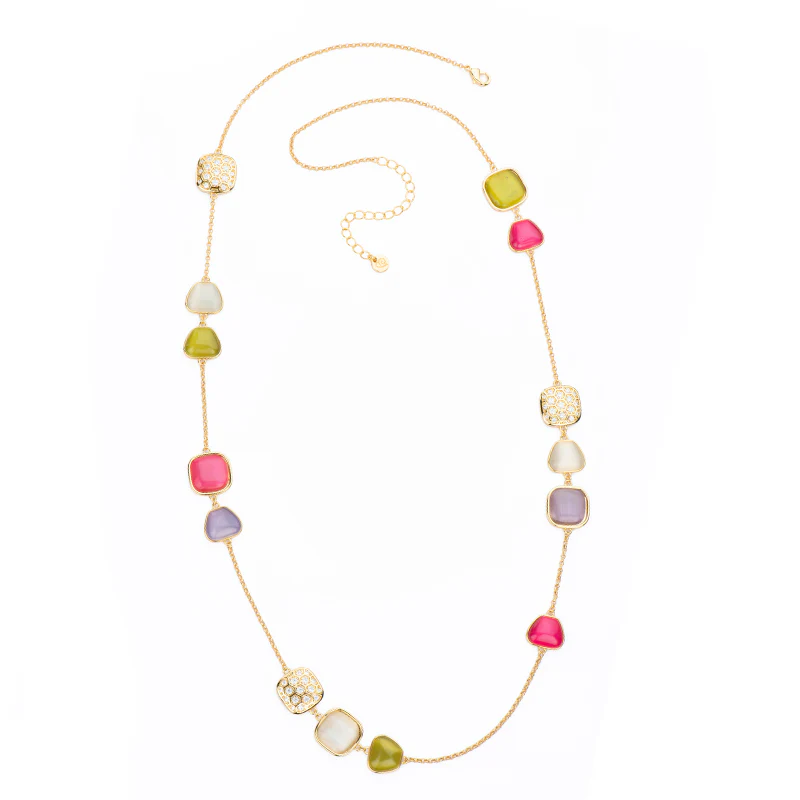 Collana in catena dorata con carrè a forma di nido d’ape in pavè di zirconi e cat eye mango, glicine, panna e lampone.